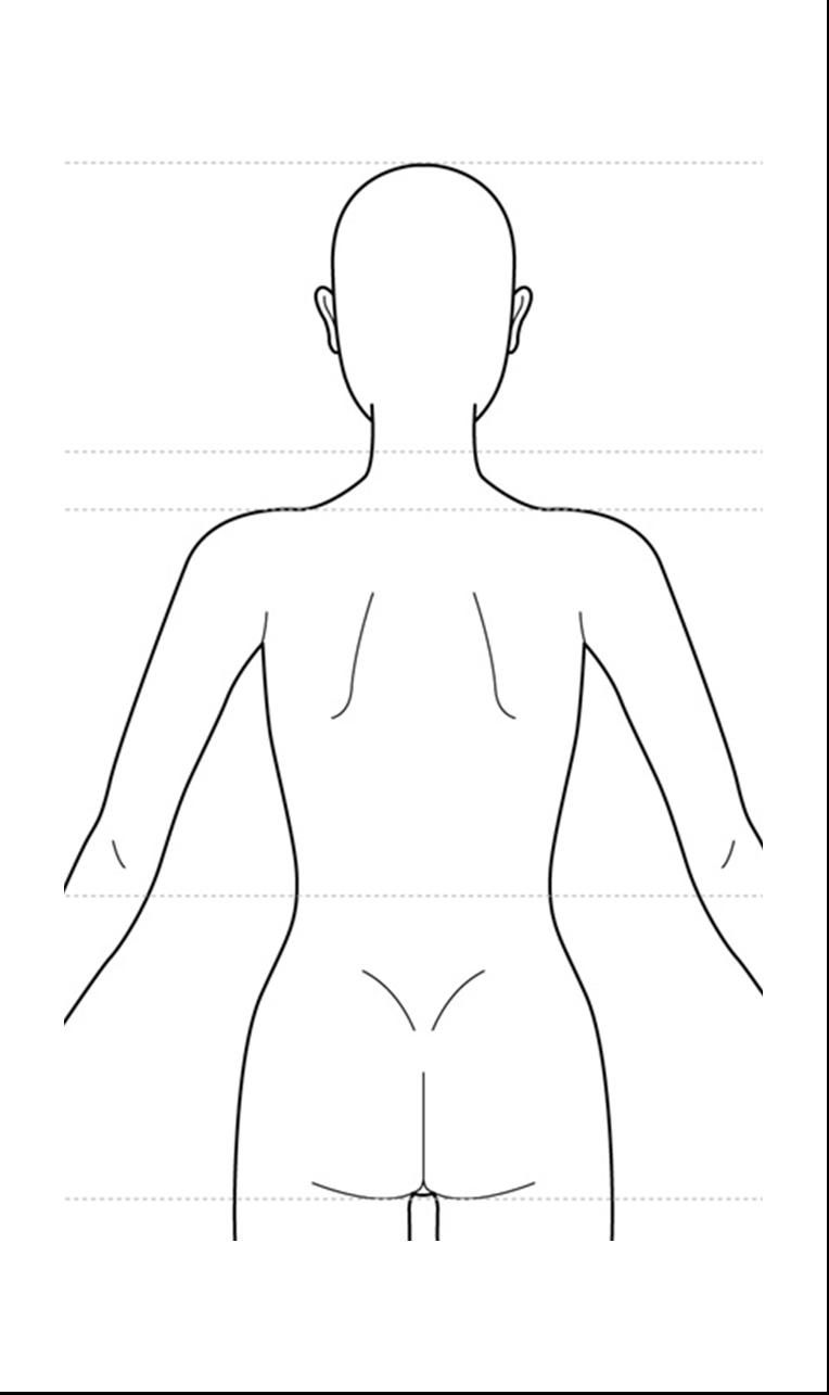 問3:広背筋(ヒント:背部の筋肉で、下方に三角形をなす筋肉)を、身体のどの部分に位置するかが分かるように右図に書き入れて下さい。